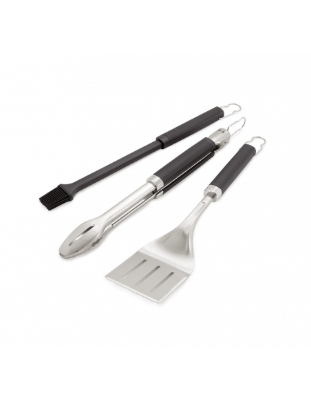 Set 3 accessori Weber che comprende pinza, spatola e forchettone. In acciaio inossidabile con impugnatura in gomma antiscivolo e dotati di gancio per appenderli e tenerli a portata di mano. Lunghezza 43cm.