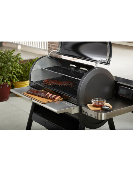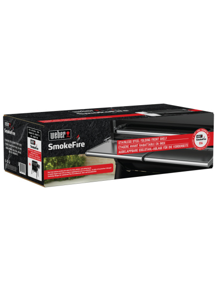 Il ripiano anteriore in acciaio INOX aggiunge spazio di lavoro. Ha una capacità massima di 9Kg per cibo e accessori per Barbecue, inclusi utensili, piatti e taglieri. Le clip nella parte inferiore sono state specificatamente progettate per immagazzinare la griglia di cottura superiore quando non è in uso.