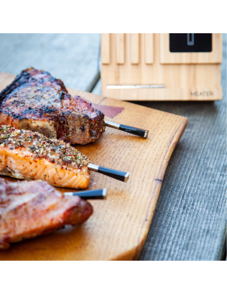 Sviluppato con tecnologia all'avanguardia combinata con un'insaziabile passione per cibi appetitosi e cucinati alla perfezione. MEATER Block è il leggendario strumento di cottura dotato di 4 sonde numerate. Bistecca rare per te, medium per il tuo ospite, medium rare per un tuo parente e ben cotta per nessuno. Clip sonda incluse.