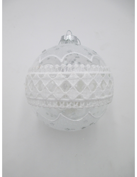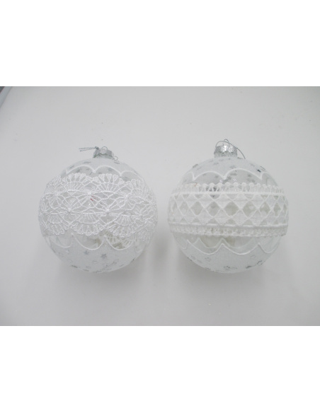 Pallina di Natale, Sfera di Vetro, 10 Cm, Trasparente con Pizzo, Decorazione in Pizzo e Stelline Argento, Scacchi o Astratto