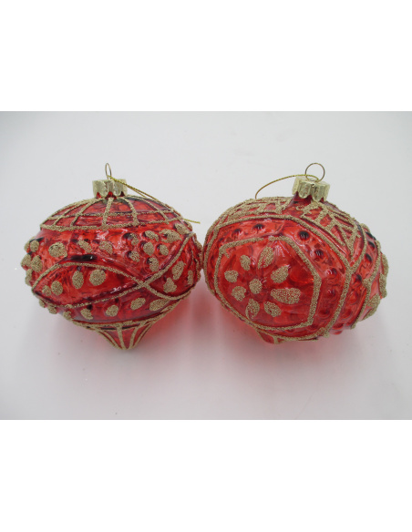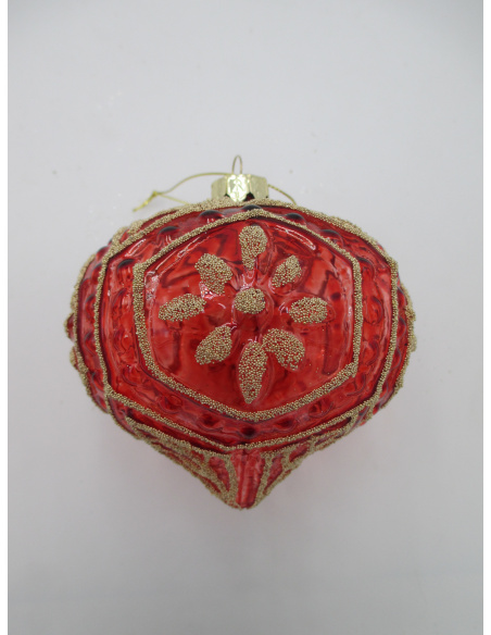 Pallina di Natale, Cipolla di Vetro, 10 Cm, Rosso Trasparente, Decorazione Barocca in Glitter Oro, Onda o Esagono