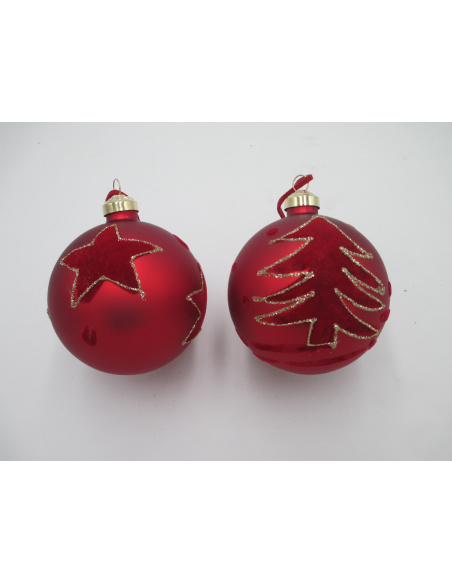 Pallina di Natale, Sfera di Vetro, 8 Cm, Rosso Opaco con Decorazione Glitter Oro e Velluto Rosso, Assortite - Stella o Albero