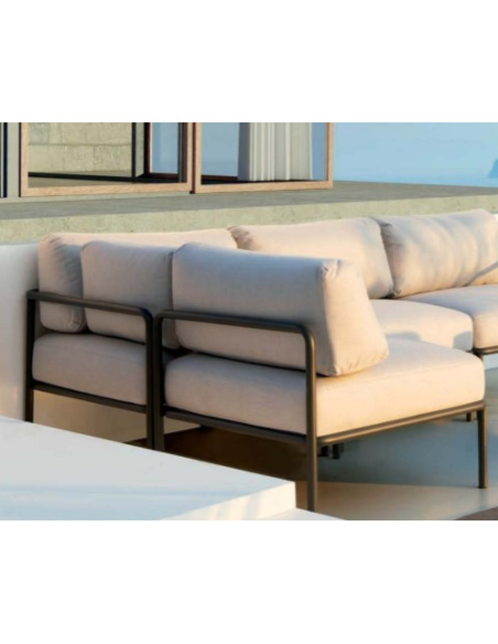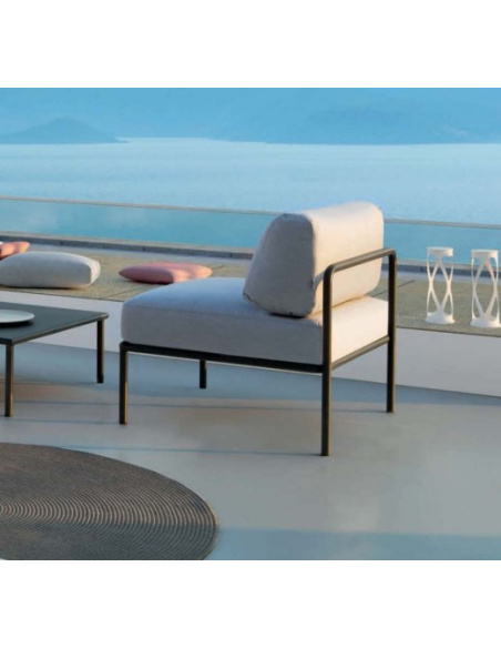 Poltrone modulari realizzare in ferro zincato verniciato a polveri e cuscineria sfoderabile di altissima qualità per esterno, il design delle poltrone permettono la creazione di divani da due a più posti affiancandole, le misure della singola poltrona sono 80x80.