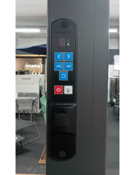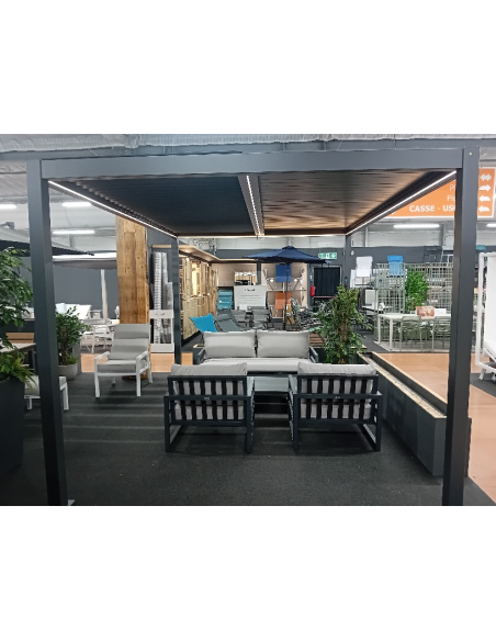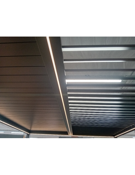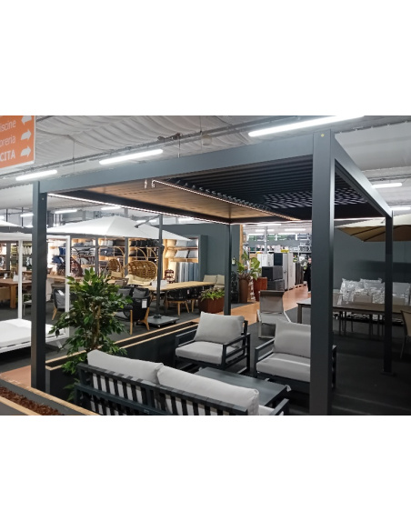 Gazebo in alluminio antracite con copertura a doppie lamelle regolabili separatamente manualmente, completo di illuminazione perimetrale a led con alimentazione a batteria ricaricabile tramite pannello solare o a corrente, centralina per la regolazione della luce a varie intensità, misura 3x4mt.