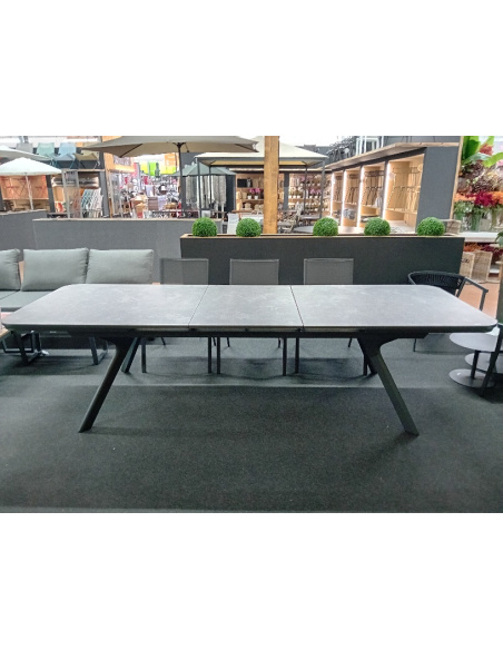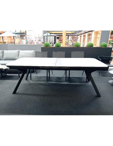 Tavolo allungabile realizzato con struttura in alluminio colore antracite e piano in vetroceramica grigio chiaro, estensibile da 230cm chiuso a 300cm aperto, larghezza 100cm