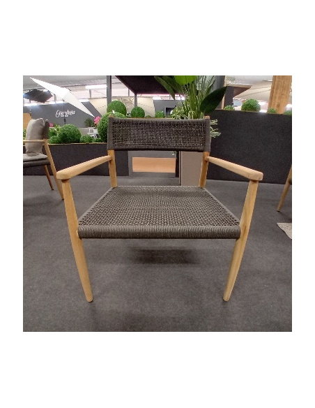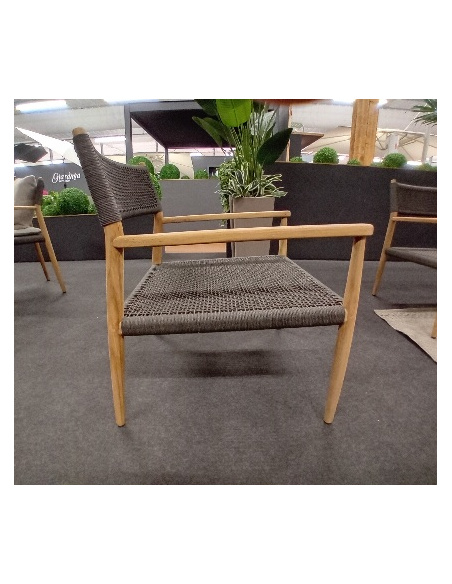 Poltrona realizzata in teak con seduta e finiture in corda sintetica resistente agi agenti atmosferici.