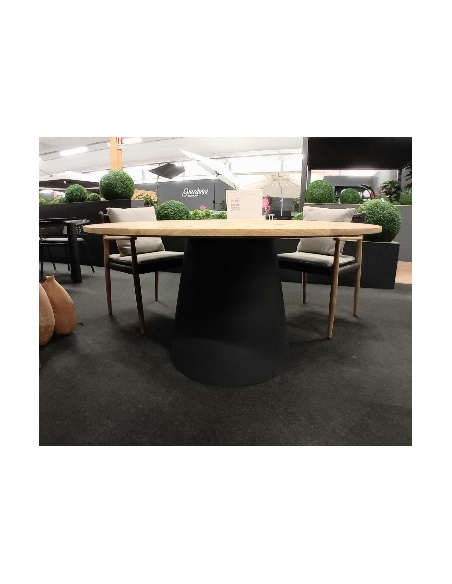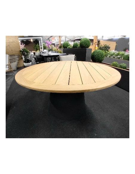 Elegante tavolo con piano in teak e struttura in alluminio verniciato a polveri colore antracite, diametro 140cm.