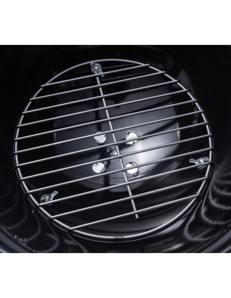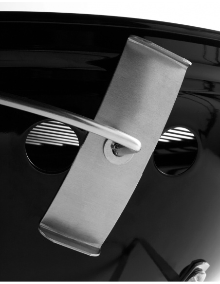 braciere e coperchio in acciaio smaltato per facilitare la pulizia e proteggere dalle intemperie. Supporto mobile per il coperchio con sistema di blocco per il trasporto, impugnatura in Nylon rinforzato con fibre di vetro. Griglia di cottura in acciaio cromato.