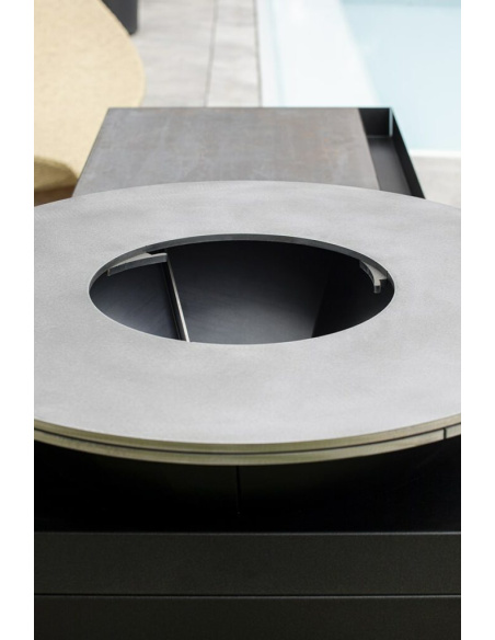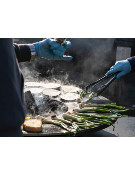 Nerone ha un comodo piano di lavoro integrato al telaio stesso del braciere. In qualsiasi punto del bordo del piano cottura si può posizionare un piano di appoggio supplementare in acciaio inox, ideale per appoggiare vassoi e piatti e tenere in caldo le vivande pronte per essere servite.