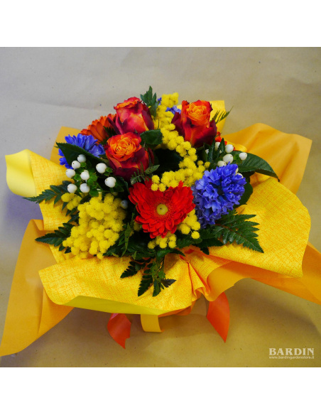 Mazzo di fiori misti con mimosa bouquet con riserva d'acqua. Confezionato con una carta colorata che trattiene l'acqua e con aggiunta del nostro speciale conservante che ne prolunga la durata.
