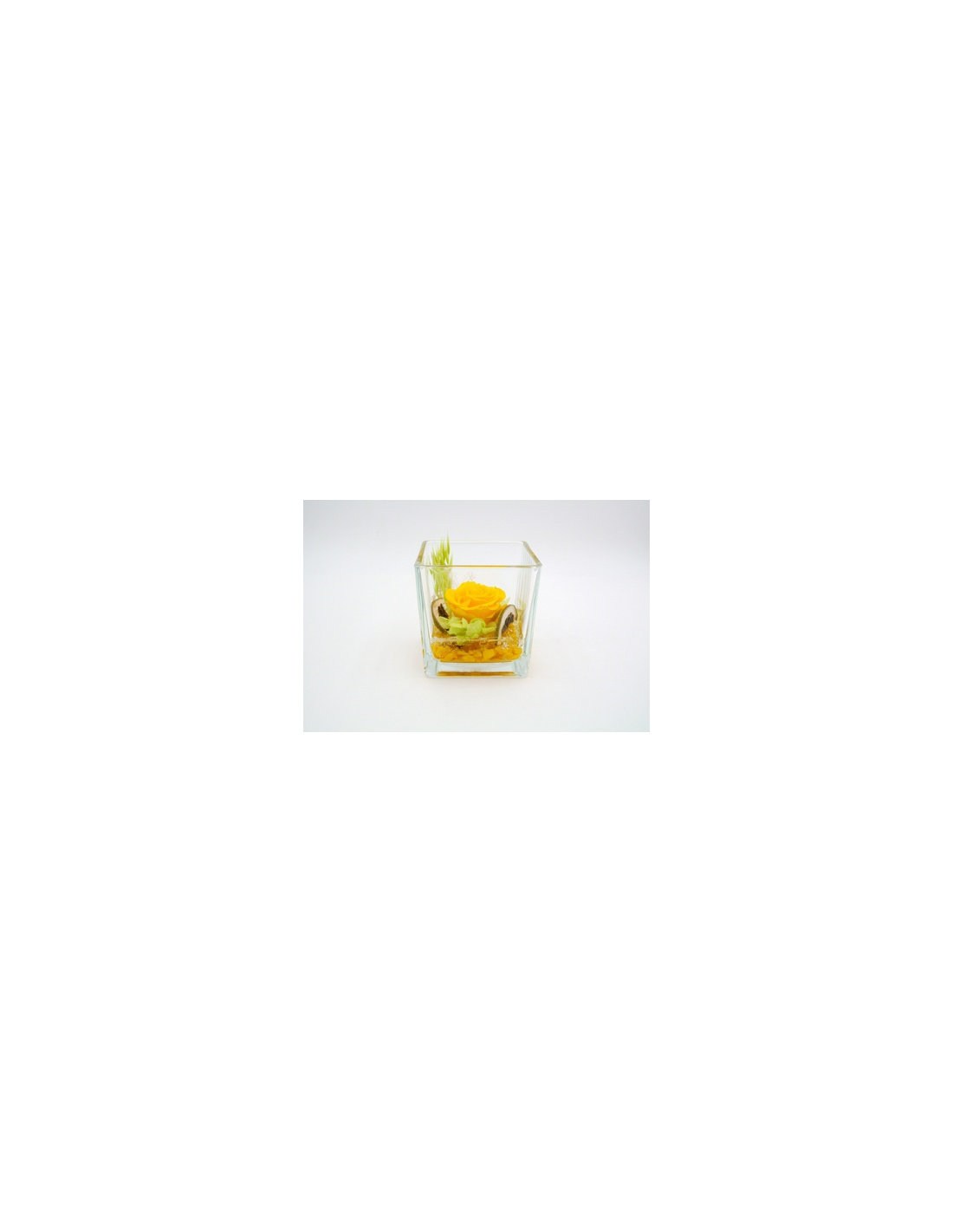 CUBO FONDO PIETRA 10x10 CON ROSA STABILIZZATA GIALLA E CIUFFETI DI ORTENSIA STABILIZZATA E AVENA.