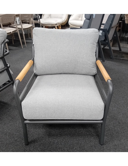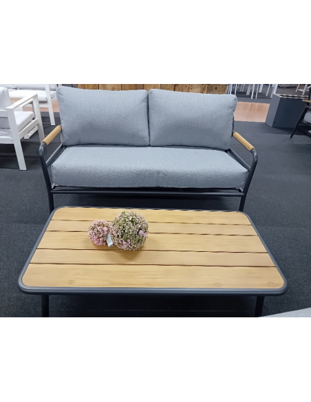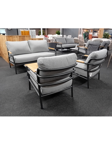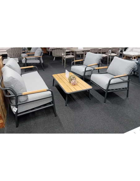 Set composto da 4 pezzi: divano due posti, 2poltrone ed un tavolino. salotto realizzato in alluminio con cuscini in tessuto olefin adatto ad ambienti esterni, top tavolino e braccioli in teak. Disponibile anche con struttura bianca e cuscini beige.