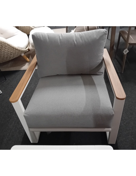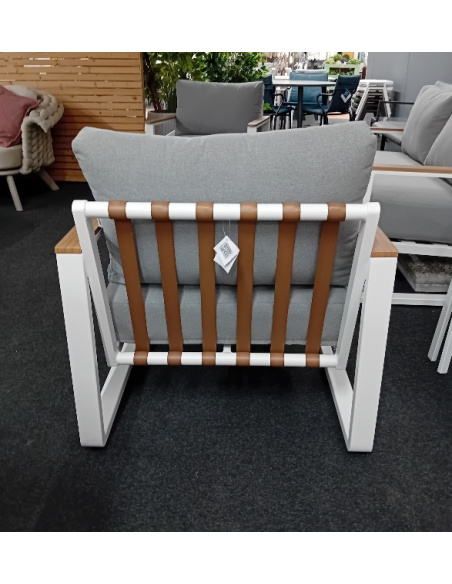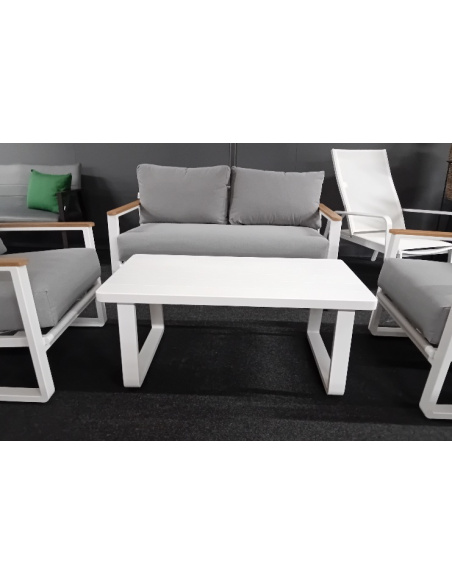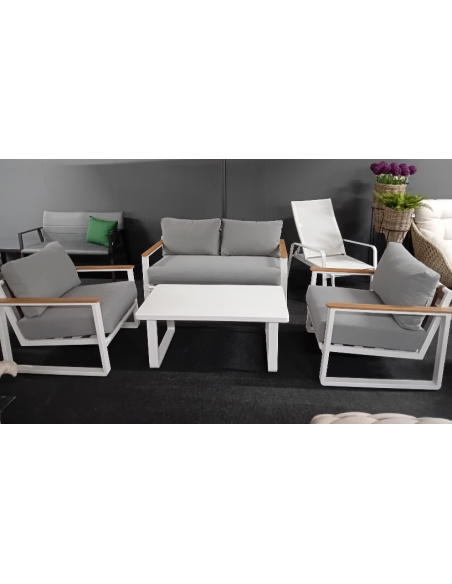 Set composto da divano due posti, due poltrone e un tavolino. Realizzato in alluminio con schienale in fettucce di ecopelle, i cuscini sono in fibra sintetica idonei ad ambienti esterni, braccioli in alluminio effetto legno.