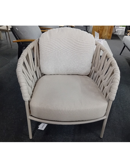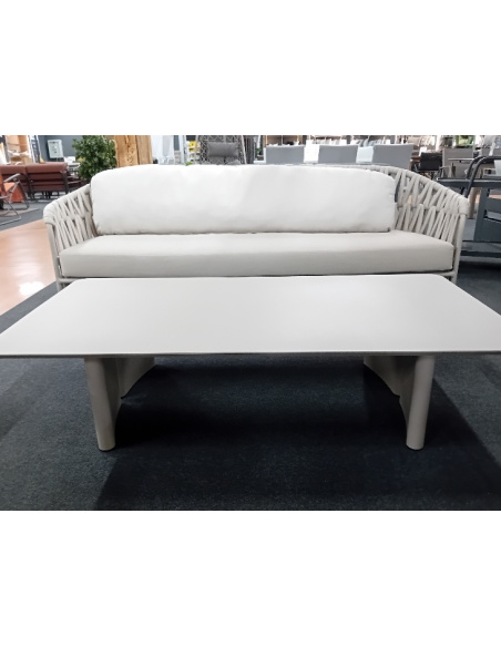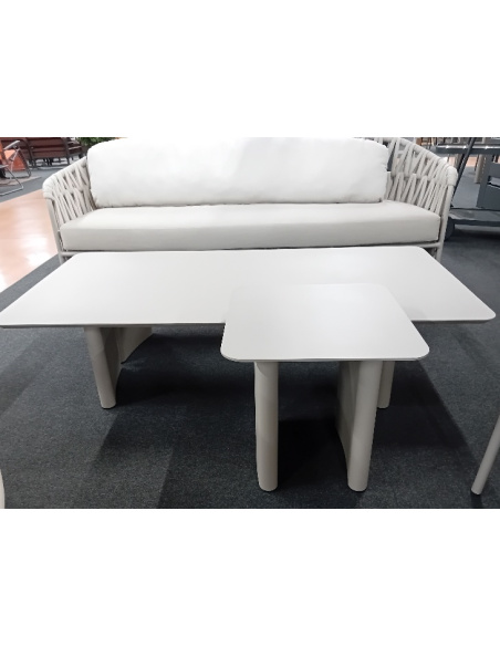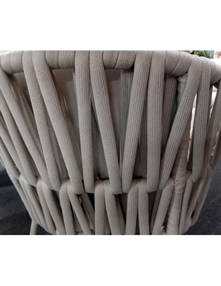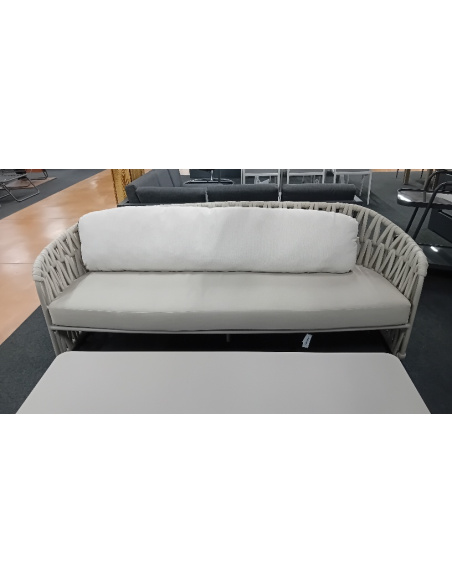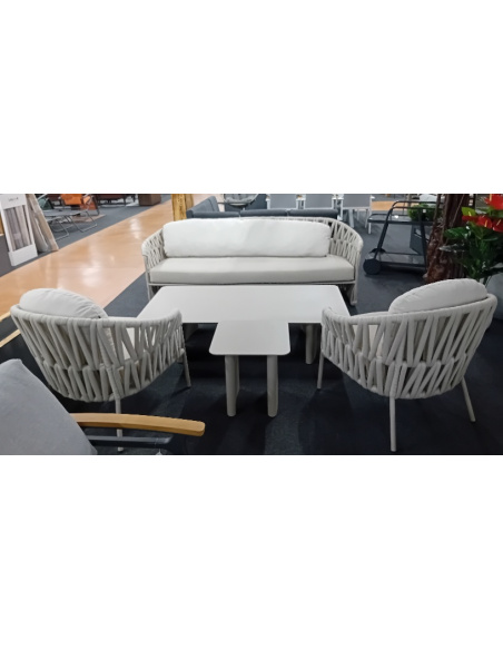 Set composto da divano tre posti, 2 poltrone, 2 tavolini. Realizzato in alluminio verniciato a poveri con finiture in corda sintetica e tessuti in poliestere adatto ad ambienti esterni.