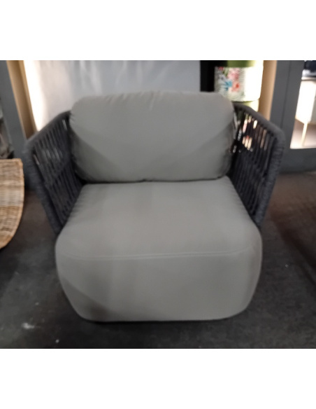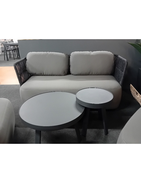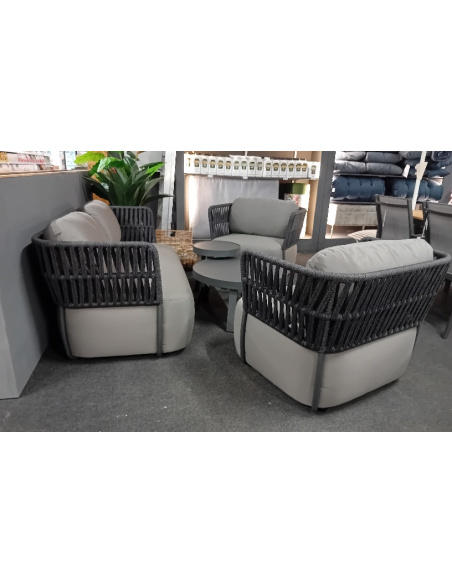 Salotto composto da divano due posti, 2 poltrone e 2 tavolini. Realizzato in alluminio con corde Olefin e cuscini in tessuto sintetico adatto ad ambienti esterni.