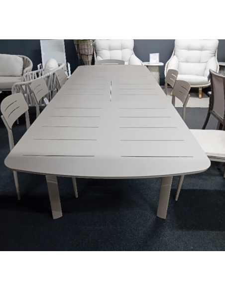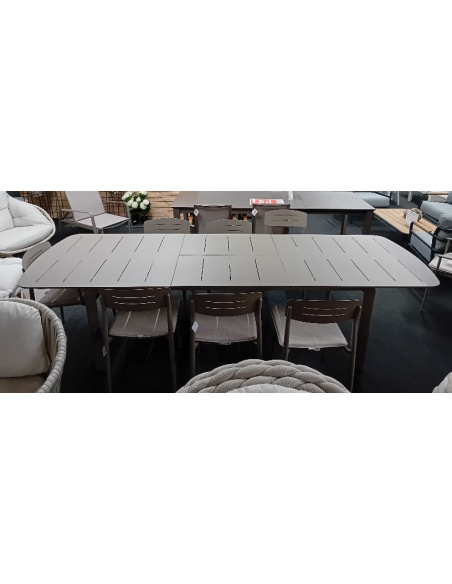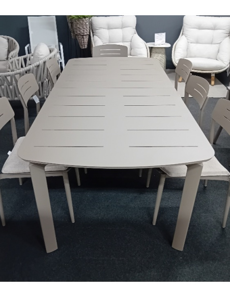 Tavolo da giardino realizzato in alluminio verniciato a polveri colore tortora, allungabile da 220cm a 300cm per una larghezza di 100cm. Disponibile anche nel colore bianco.