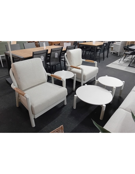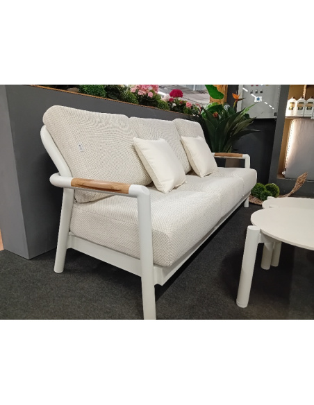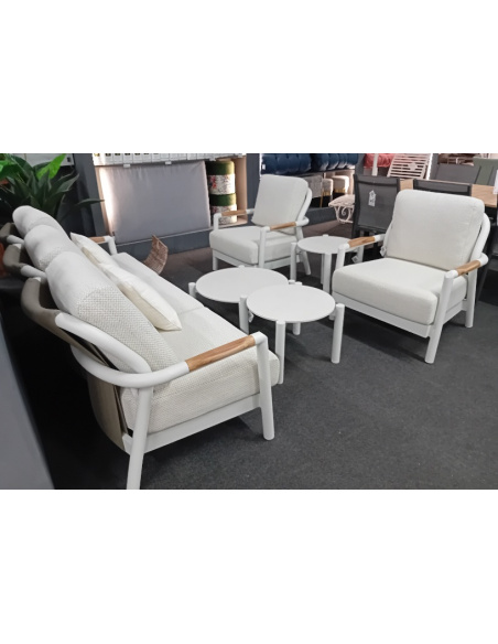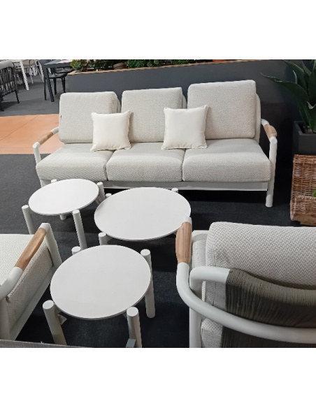 Salotto da giardino composto da divano tre posti, 2 poltrone e 3 tavolini con piano in pietra sintetica, divano e poltrone sono realizzato in alluminio verniciato a polveri con tessuti Olefin adatti ad ambienti esterni, le finiture dei braccioli sono in teak.