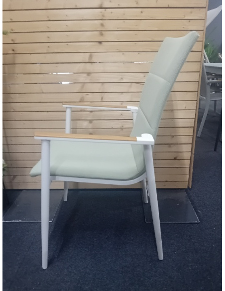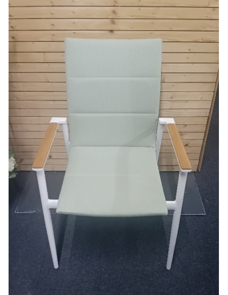 sedia da giardino realizzata in alluminio verniciato a polveri con seduta e schienale ed imbottitura in tessuto sintetico adatta ad ambienti esterni, colore struttura bianca con tessuto verde chiaro