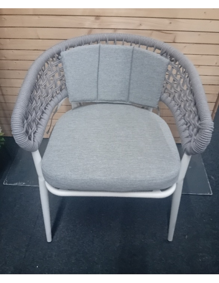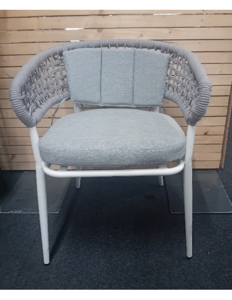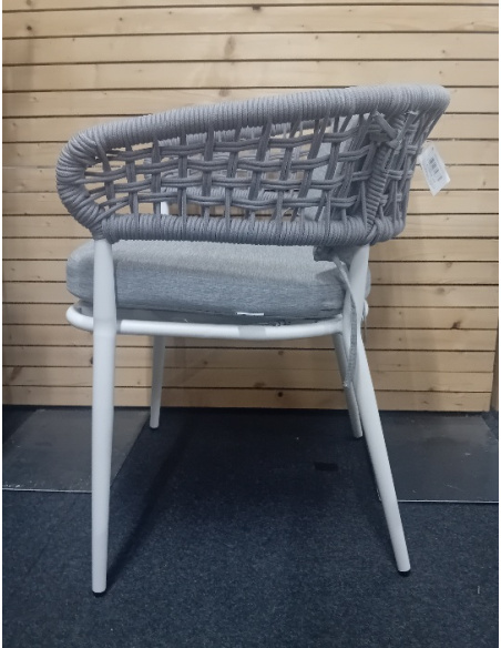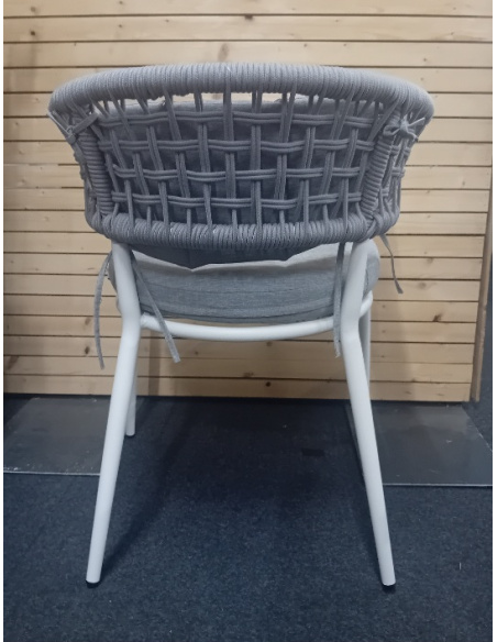 Sedia realizzata in alluminio verniciato a polveri con schienale in corda e cuscini in fibra sintetica adatti ad ambienti esterni