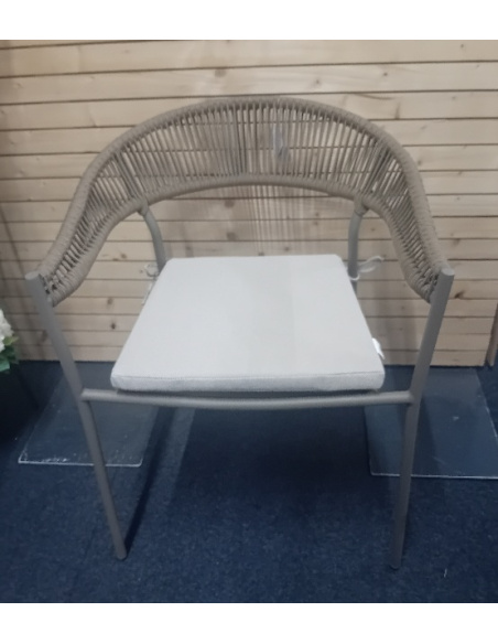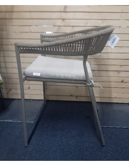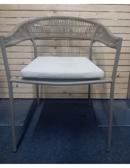 Sedia realizzata in alluminio verniciato a polveri con schienale in corda e cuscini in fibra sintetica adatti ad ambienti esterni
