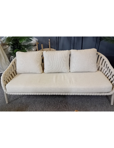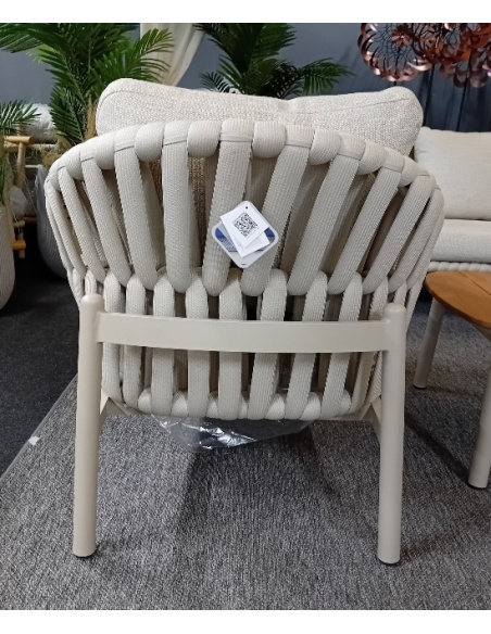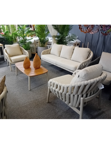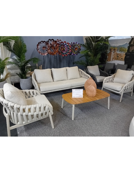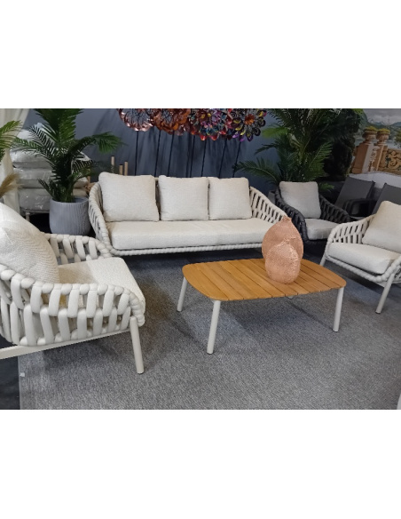 Salotto composto da divano tre posti, 2 poltrone e 1 tavolino in teak, la struttura è in alluminio verniciato a polveri con tessuti e corde di finitura in fibra sintetica adatta ad ambienti esterni.