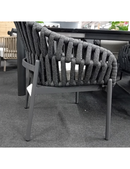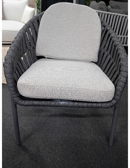 Sedia poltrona da giardino realizzata in alluminio con cuscini e corde di finitura in materiale sintetico adatti per ambienti esterni