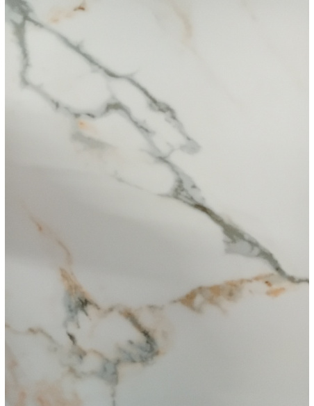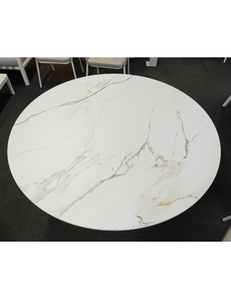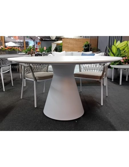 Tavolo con struttura e gamba centrale conica in alluminio verniciato a polveri, il piano è in pietra sintetica marmorizzata, diametro 140cm