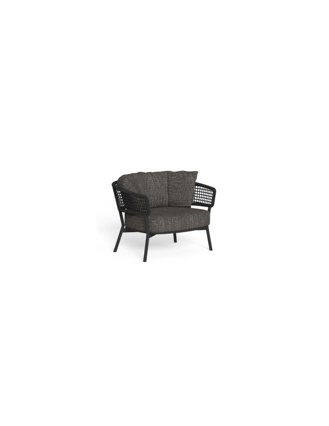 poltrona realizzata in alluminio con finiture in corda nautica, i cuscini sono sfoderabili con imbottitura quick dry foam adatto ad ambienti esterni