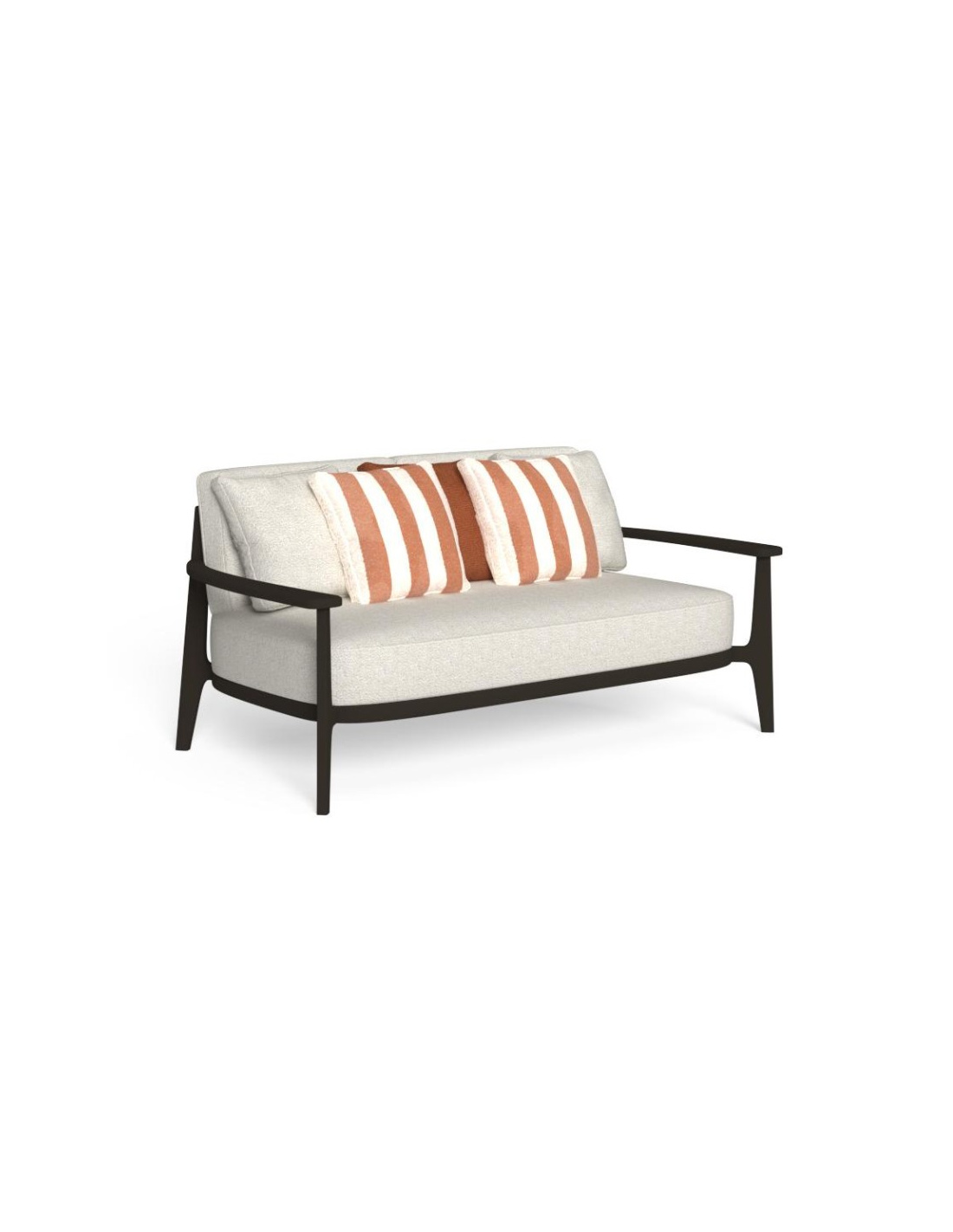 Divano 2 posti realizzato in alluminio verniciato a polveri colore mokka e cuscini sfoderabili colore inkas white realizzati con tessuto adatto agli ambienti esterni ed imbottitura quick dry foam
