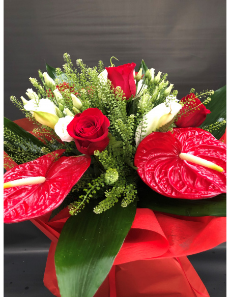 BOUQUET DI FIORI REALIZZATO CON ROSE ROSSE, CALLE BIANCHE, LISIANTHUS BIANCHI, ANTHURIUM ROSSI.