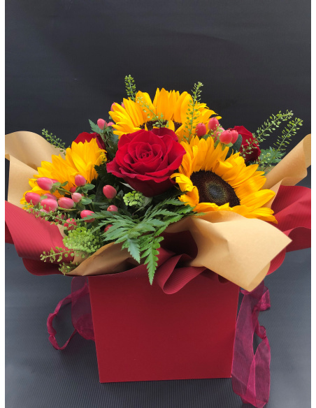 MAZZO DI FIORI CON RISERVA D'ACQUA, REALIZZATO CON GIRASOLI, ROSE ROSSE E BACCHE DI HYPERICUM, CONFEZIONATO CON CARTA IMPERMEABILE E BOX ROSSA