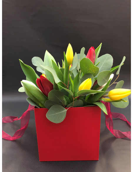 MAZZO DI FIORI CON RISERVA D'ACQUA REALIZZATO CON TULIPANI DI COLORI MISTI.