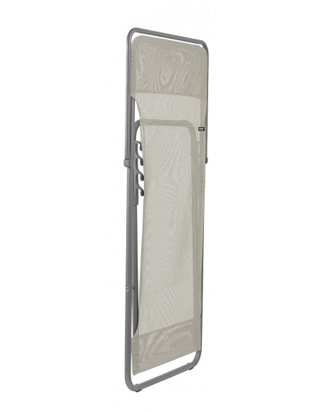 SDRAIO DA ESTERNI CON AMPIO TELAIO,CHIUSURA ULTRA COMPATTA, STRUTTURA IN TUBO D'ACCIAIO, SENZA TRAVERSA SUL DAVANTI DELLA SEDUTA, REGOLABILE IN 4 POSIZIONI, TELA AMOVIBILE, PIEDINI D'APPOGGIO.