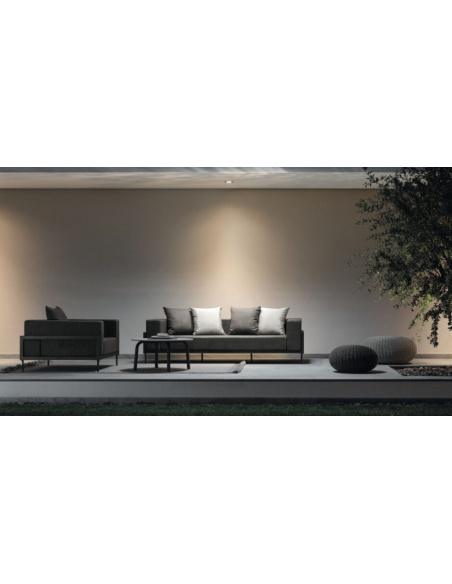 Il divano modulare da esterni CleoAlu ha una struttura in alluminio dal carattere rigido e geometrico.