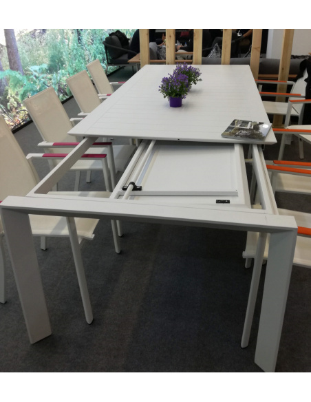 TAVOLO DA GIARDINO ALLUNGABILE CON STRUTTURA INTERAMENTE IN ALLUMINIO. IL SISTEMA PROLUNGA A ROTAIA PERMETTE DI SPOSTARE ESTERNAMENTE LE GAMBE DEL TAVOLO. SI CONSIGLIA L'ABBINAMENTO ALLA POLTRONCINA MODELLO VENEZIA
