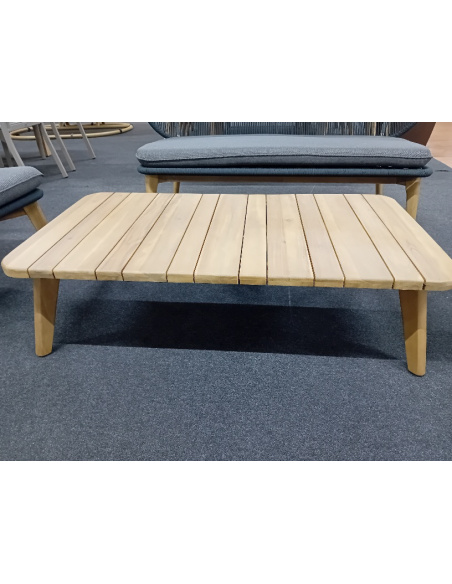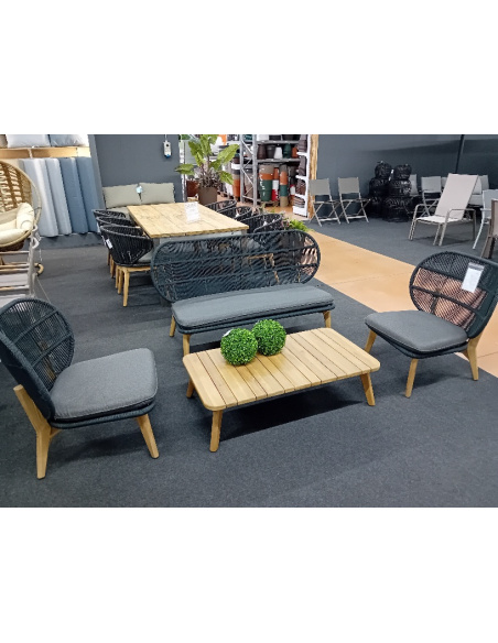 Set composto da divano due posti, due poltrone e tavolino, i cuscini sono in tessuto olefin, sfoderabili e resistenti allo scolorimento, il tavolino è interamente in legno di acacia.