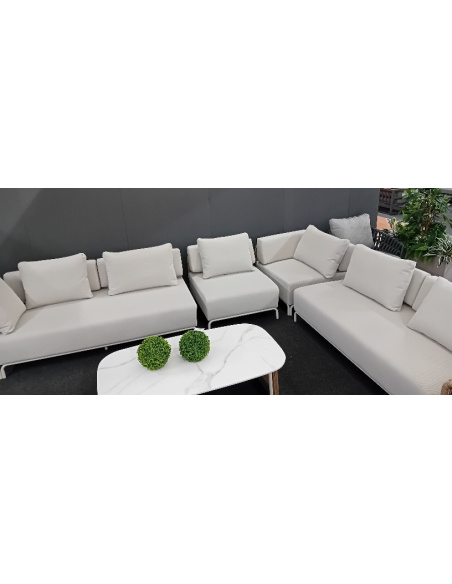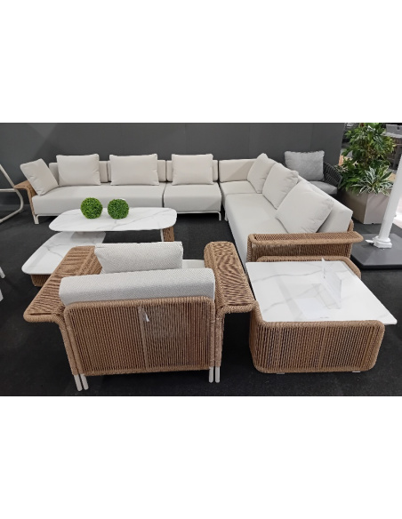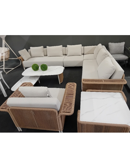 Salotto angolare composto da 2 moduli divano, 1 modulo angolare, 1 modulo mediano, 1 poltrona, 1 tavolino fisso e 1 tavolino doppiabile.