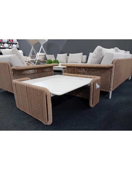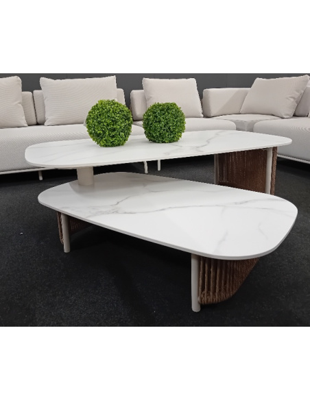 Piano dei tavolini in pietra sintetica molto resistenti a graffi e agenti atmosferici.