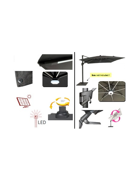 LED INTEGRATI SU STECCHE E LAMPADA CENTRALE CON ALIMENTAZIONE A PANNELLO SOLARE E CAVO USB COLLEGATO AD UNA PRATICA CENTRALINA ESTRAIBILE. COMPLETO DI PRATICA PEDALINA PER PERMETTERE LA RITAZONE DI 360° E SISTEMA PER IL BASCULAMENTO LATERALE. DISPONIBILE NELLA VERSIONE CON TELO E STRUTTURA ANTRACITE.