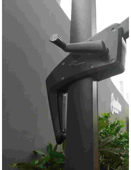 OMBRELLONE A BRACCIO LATERALE DI MISURA 3X3 METRI, STRUTTURA IN ALLUMINIO, PRATICA MANOVELLA PER L'APERTURA, TELO IN POLIESTERE DA 180 GR CON CAMINO ANTIVENTO. PRATICA PEDALINA ALLA BASE CHE PERMETTE LA ROTAZIONE DI 360°. SONO DISPONIBILI I RICAMBI PER TELI E STECCHE.