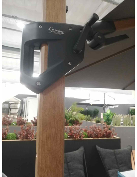 OMBRELLONE A BRACCIO LATERALE DI MISURA 3X3 METRI, STRUTTURA IN ALLUMINIO CON COLORAZIONE EFFETTO LEGNO, PRATICA MANOVELLA PER L'APERTURA E LA CHIUSURA, TELO IN OLEFIN TORTORA DA 250 GR. CON CAMINO ANTIVENTO. PRATICA PEDALINA PER PERMETTERE LA ROTAZIOONE A 360°. COMPLETO DI SISTEMA PER IL BASCULAMENTO LATERALE.