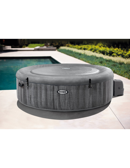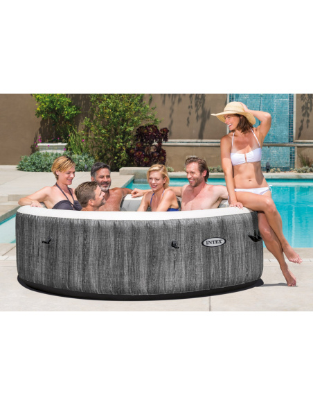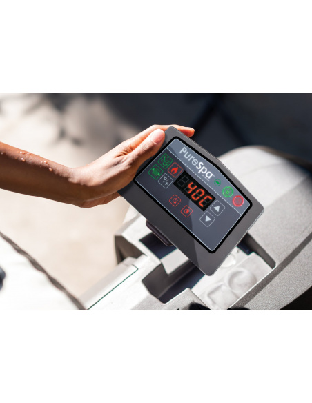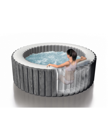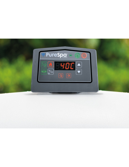 La PURE SPA GREYWOOD DELUXE 216X71CM 6 POSTI è la perfetta vasca idromassaggio per trascorrere in totale relax le vostre giornate. Dotata di 140 getti, è realizzata con l'innovativa struttura Fiber-Tech che offre il massimo comfort e resistenza e grazie all'innovativo sistema anticalcare e al filtro a cartuccia avrete un'acqua sempre pulita e, nei mesi più freddi, potrete riscaldare la temperatura dell'acqua sino ai 40°. Grazie al Pannello di Controllo Touch Screen e alla nuova APP gestirete con la massima comodità le funzioni della vostra SPA, metre le maniglie poste sul liner consentono di spostarla comodamente. Inclusi nella confezione Due poggiatesta e la Luce LED Multicolor per illuminare le vostre serate in totale relax