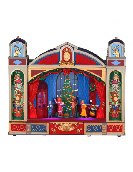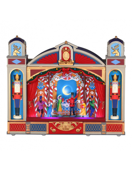 Questo potrebbe essere uno dei pezzi più sorprendenti mai costruiti. Un fantastico spettacolo musicale natalizio con tre diversi balletti in cui la scena / gli sfondi cambiano automaticamente per ogni balletto. Dettagli: 1. Ci sono tre diversi balletti eseguiti a turno. 2. Ci sono tre cambi di scena in cui le tavole di sfondo del palco girano rivelando una nuova scena di balletto. 3. I pannelli di sfondo sulla torre sinistra e destra cambiano ad ogni cambio di scena. 4. Le figure girano sul palco.